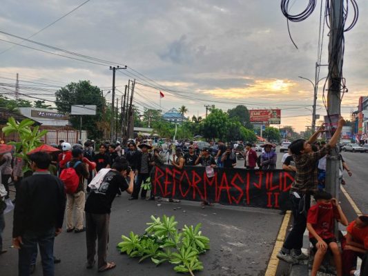 Di depan kantor Gubernur Sulawesi Selatan, massa aksi membentangkan spanduk tuntutan bertuliskan “Reformasi Jilid II” serta satu keranda mayat sebagai bentuk protes terhadap pemerintah.